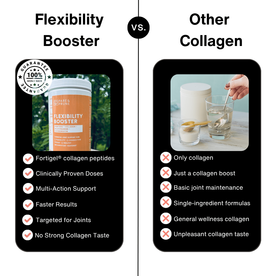 Flexibility Booster combines collagen with glucosamine and chondroitin in clinically proven doses, offering a multi-action approach to joint health. While many collagen supplements only focus on overall wellness, Flexibility Booster specifically targets joint flexibility, mobility, and stiffness for more effective results.